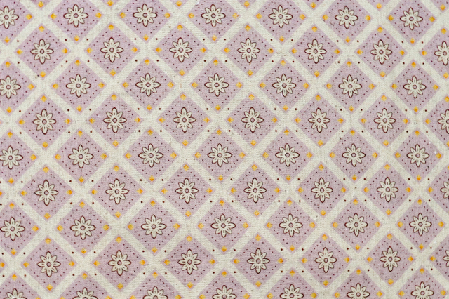 綿カスの残る茶色を帯びた生成り地に、角にオレンジドットを添えたパープルのひし形に花が咲いているハーフリネン生地です。