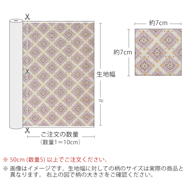 オーダーカット販売 生地幅×10cm単位(ご注文数量1=10cm) 必ず50cm(数量5)以上でご注文下さい(売切れの場合は除きます) 例)「数量5」でご注文→生地幅×50cmの生地 「数量23」でご注文→生地幅×230cmの生地 |