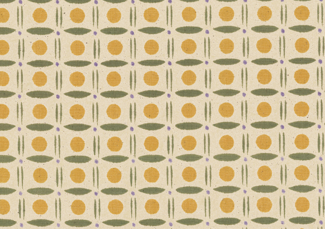 クリーム寄りの生成地に、イエローとパープルの大小ドットとグリーンの格子で構成されたさわやかな印象のコットン生地です。