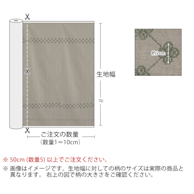 オーダーカット販売 生地幅×10cm単位(ご注文数量1=10cm) 必ず50cm(数量5)以上でご注文下さい(売切れの場合は除きます) 例)「数量5」でご注文→生地幅×50cmの生地 「数量23」でご注文→生地幅×230cmの生地 |