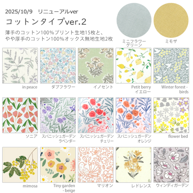 ・本商品は頻繁に商品内容のリニューアルを行います。お買い物かごに入れた時点ではなく、購入時点の商品内容が届きます。 ・生地のサイズは裁断上、前後する場合がございます。サイズは毎回寸分違わず絶対に正確なものではありません。 ・生地の耳(白地に生地名・メーカー名などが記載されている部分)が含まれます。 ・一部の生地にみられる黒の点々は汚れや不良ではありません。コットンの殻のかけらで、自然そのままの布地ならではの風合いです。 |
