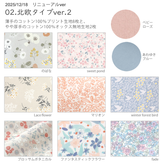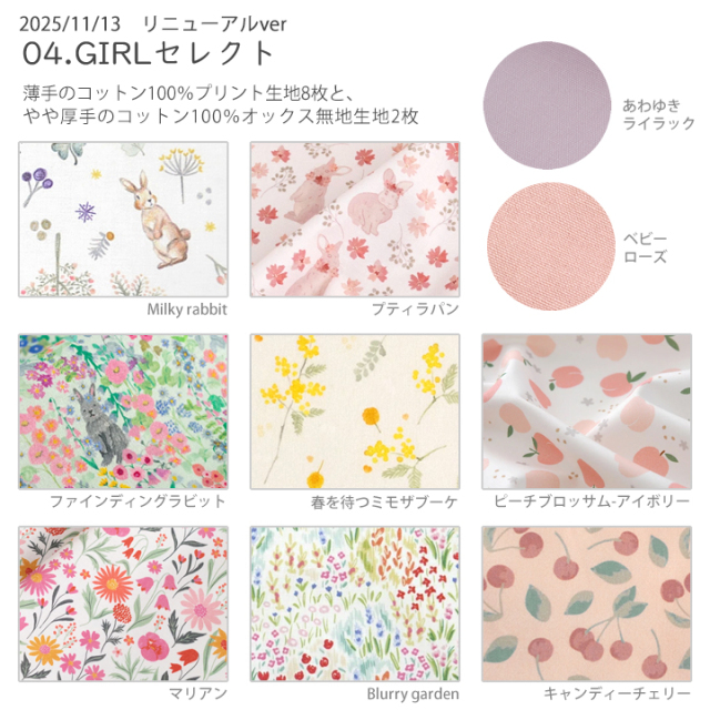 ・本商品は頻繁に商品内容のリニューアルを行います。お買い物かごに入れた時点ではなく、購入時点の商品内容が届きます。 ・生地のサイズは裁断上、前後する場合がございます。サイズは毎回寸分違わず絶対に正確なものではありません。 ・生地の耳(白地に生地名・メーカー名などが記載されている部分)が含まれます。 ・一部の生地にみられる黒の点々は汚れや不良ではありません。コットンの殻のかけらで、自然そのままの布地ならではの風合いです。 |