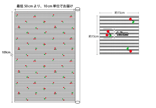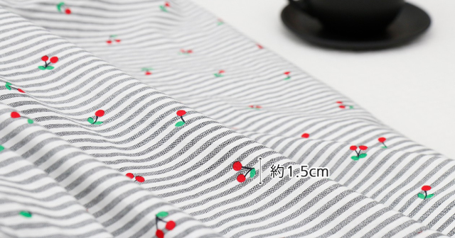 ぼかしのかかったグレーストライプに赤いさくらんぼがポイントになったコットン生地です。