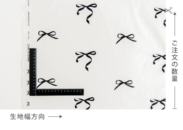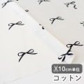 ごくわずかに黄みがかったオフ白地にブラックのシルエットが目を引く、手書き風のリボンが印象的なコットン生地です。