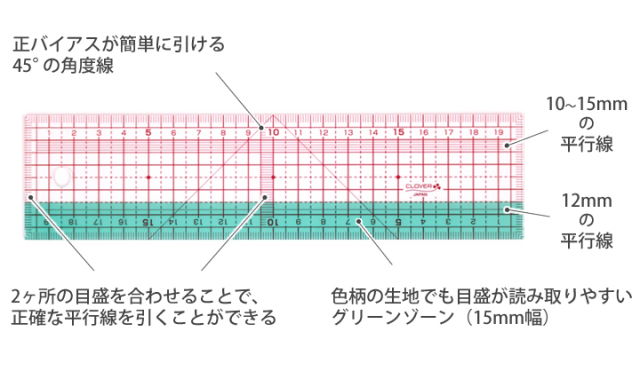 濃い色の布や柄でも目盛りが見やすい20cmの方眼定規。