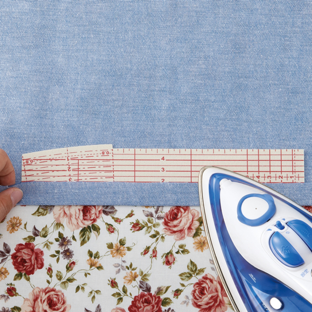 折りたい幅のラインに合わせて、すそ上げや三つ折りなど、布の折り返しを手早く簡単に。