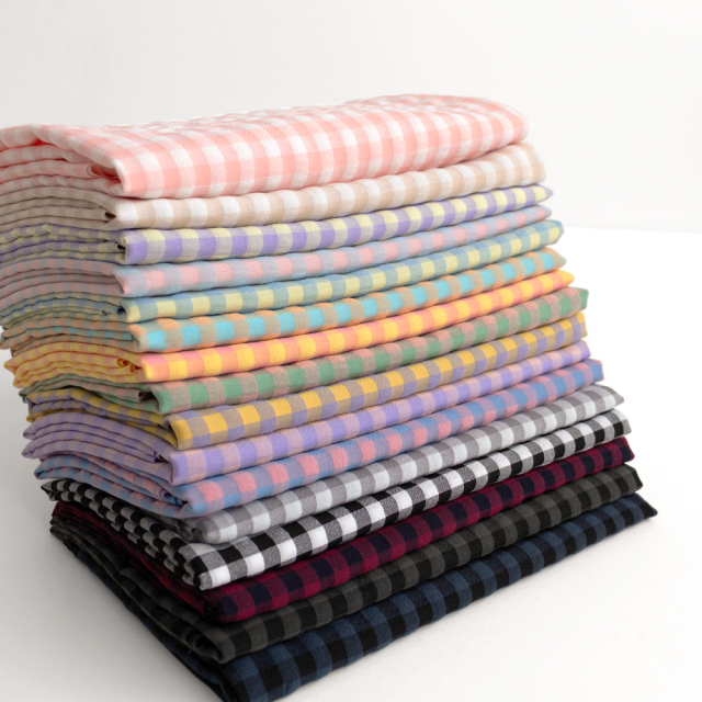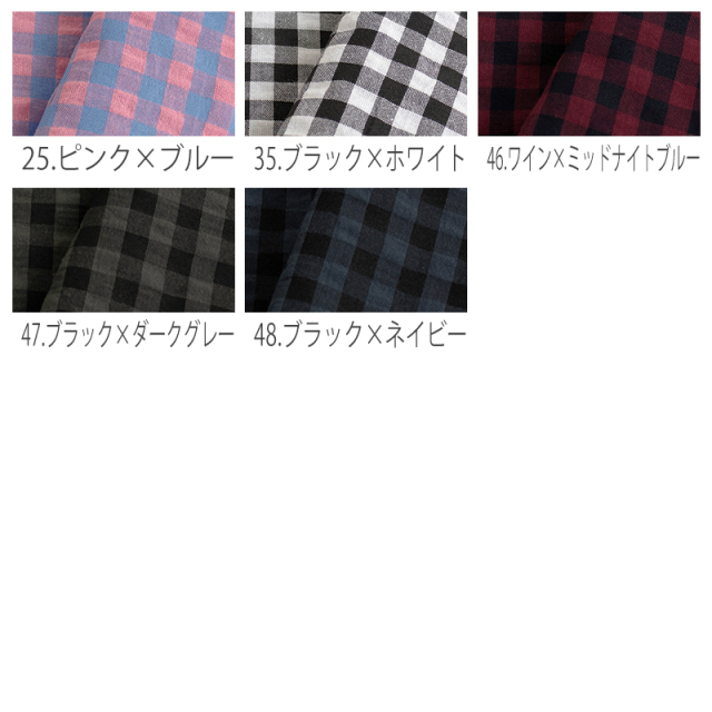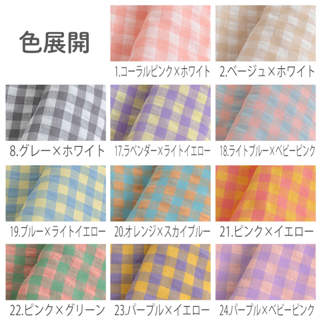 綿ポリ生地 パレット チェック 素材:コットン50%・ポリエステル50% 生地幅:約141cm 柄の向き:なし 厚み:普通(ぽこぽことした凹凸のある生地の為、厚みは部分的に異なります。(0.17~0.23mm))