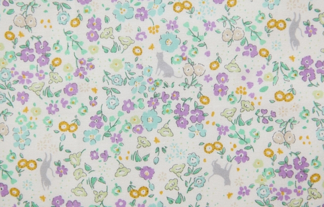 オフホワイト地に、ラベンダー色や水色、黄色の花々が一面に咲く中、