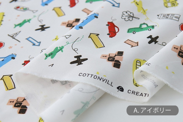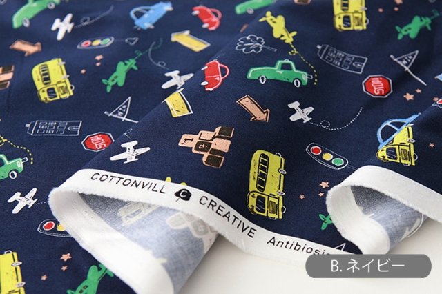 自動車やバス、飛行機、信号機や道路標識が賑やかにデザインされたコットン生地です。