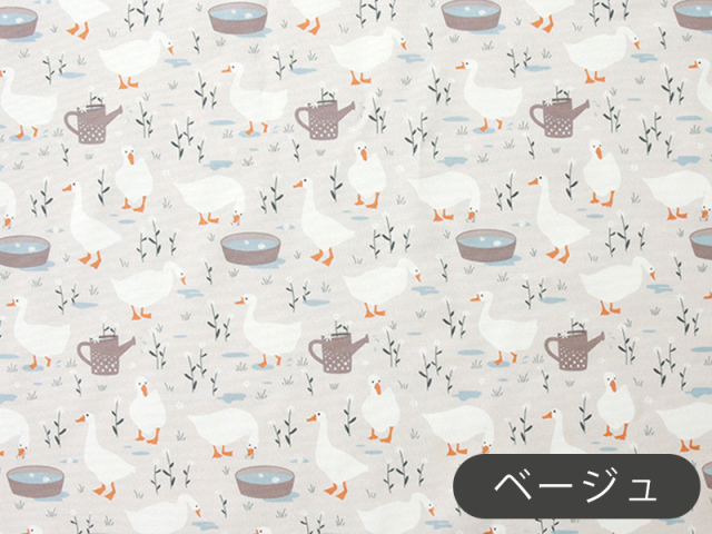 野の花や水たまり、丸みを帯びた白いガチョウが可愛らしく描かれたコットン生地です。