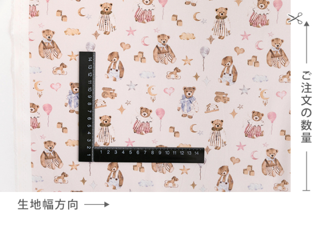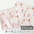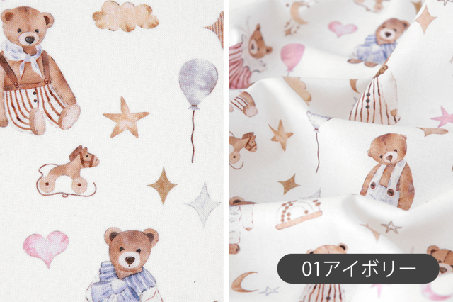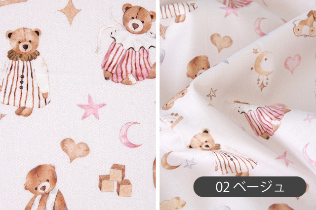 薄いアイボリー地・ピンクベージュ地に、お洋服を着たテディベアと、星や月、ハート、風船などの夢いっぱいのモチーフをちりばめたあたたかみのあるデザインのオーガニックコットン生地です。