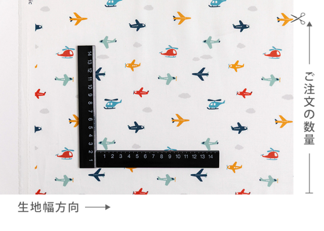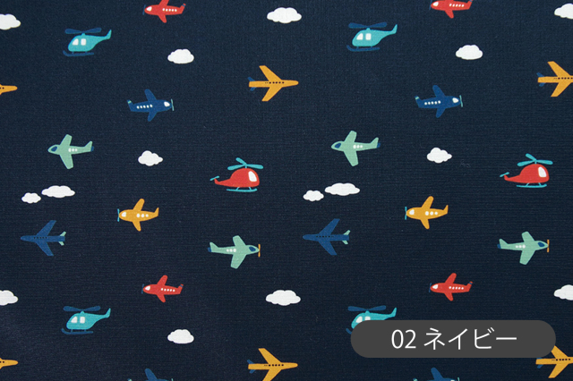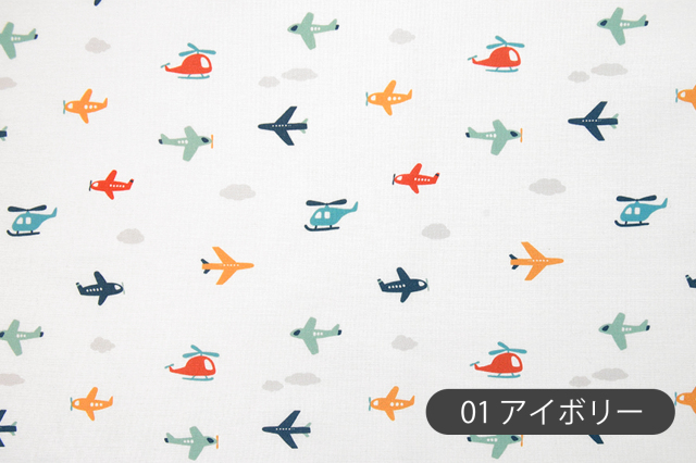 まるでおもちゃのように可愛らしい飛行機モチーフが視線を惹きつける、シンプルでミニマルなデザインのコットン生地です。