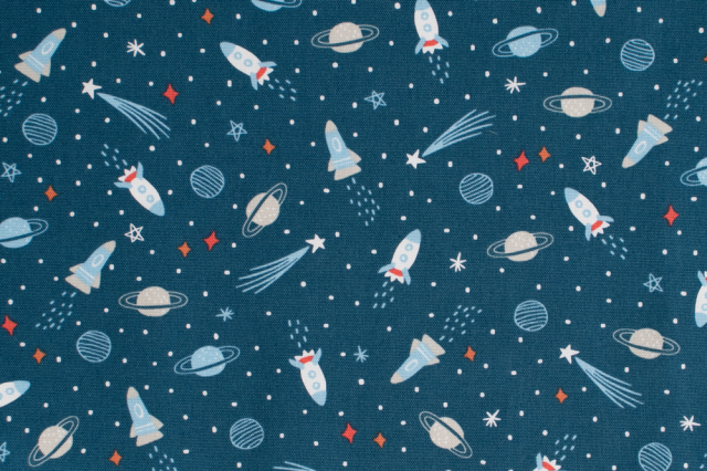 明るいネイビー地に、ロケットや惑星、流れ星などが描かれています。