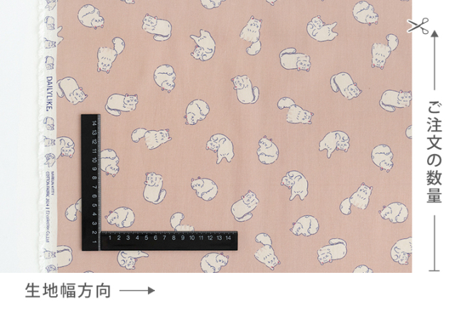 オーダーカット販売 生地幅×10cm単位(ご注文数量1=10cm) 必ず50cm(数量5)以上でご注文下さい(売切れの場合は除きます) 例)「数量5」でご注文→生地幅×50cmの生地 「数量23」でご注文→生地幅×230cmの生地 |