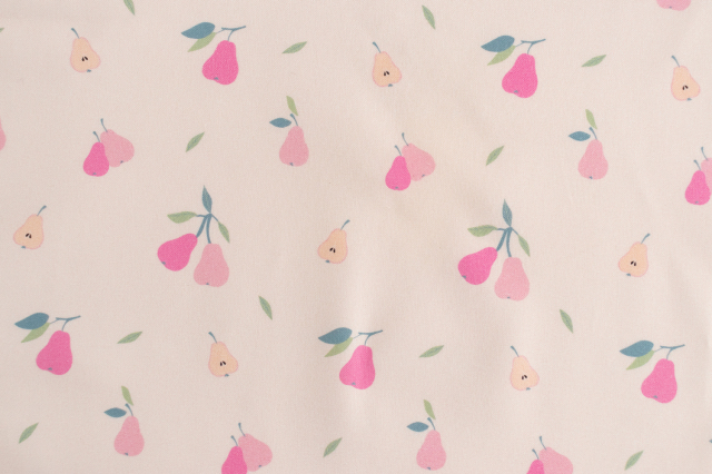 ごく薄いピンク地に、ビビットピンクとライトピンクの洋ナシや、洋ナシの切り口、葉っぱがランダムに配置されたコットン生地です。