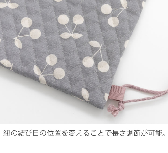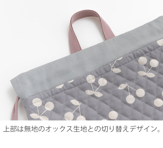 本体布:キルティング生地 表 コットン100%(オックス) 裏 コットン・ポリエステル 中綿 ポリエステル100% 上部布:オックス生地 コットン100% 持ち手(ループ):綾テープ アクリルまたはポリエステル カラーひも:アクリルまたはポリエステル |