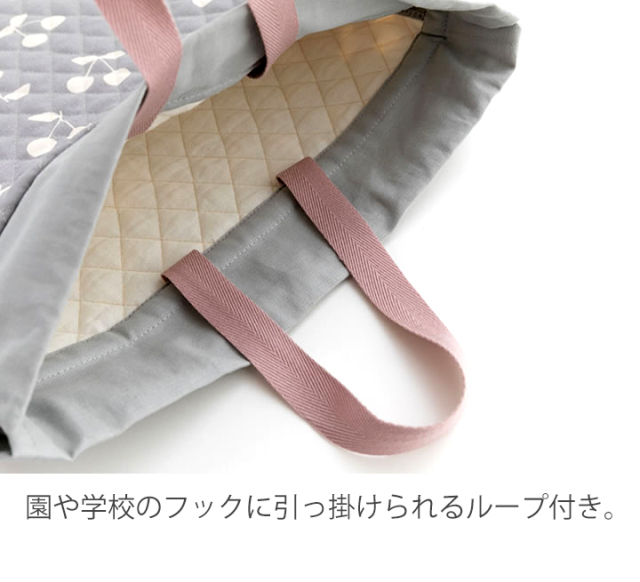 ナップサックは、短めのループを取り付け、フックなどに引っかけた時に床につきにくい設計になっています。