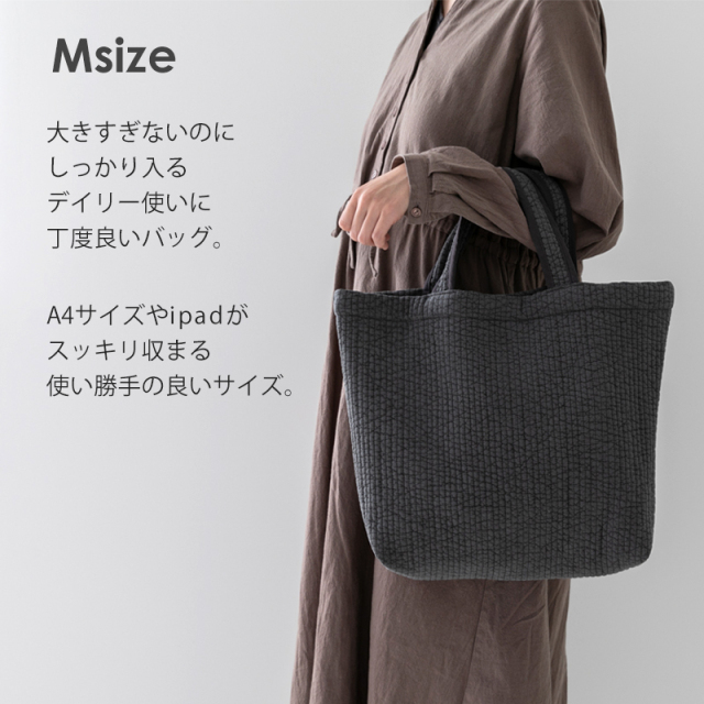 Mサイズは、A4サイズが縦でも横でもすっきり収まる使い勝手の良いサイズ感で、通勤や通学にもおすすめ。約10cmのマチ付きで収納力はバッチリ!