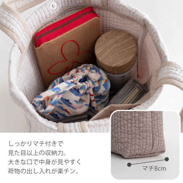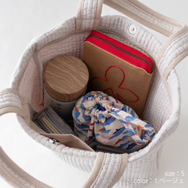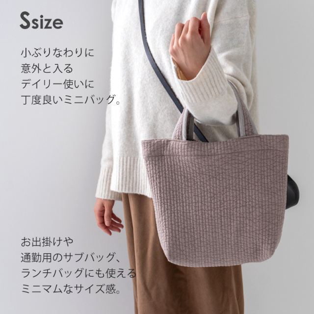 Sサイズは小ぶりなわりに意外と入るので、コンパクトにまとめたい方におすすめ!約8cmのマチ付きなのでコンパクト見えで収納力もしっかりほしい方に◎
