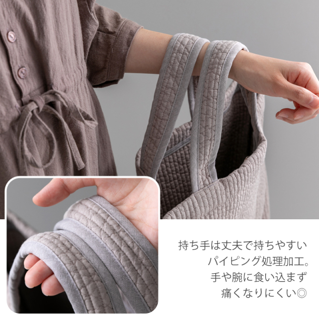 持ち手はパイピングにすることで、手が痛くなりにくく、たくさん荷物を入れても安心な丈夫さ◎