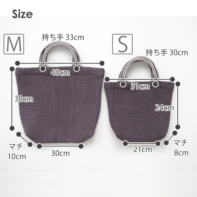 【Mサイズ】 幅:約40cm(底幅:約30cm)×高さ:30cm×マチ:10cm 持ち手(長さ) 33cm 内ポケット(長さ) 縦:約17.5cm×横:約20cm 【Sサイズ】 幅:約31cm(底幅:約21cm)×高さ:24cm×マチ:8cm 持ち手(長さ) 31cm 内ポケット 縦:約15cm×横:約17cm 底板:約22.5cm×8cm(厚さ2.5mm) |