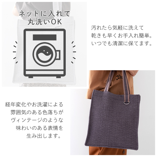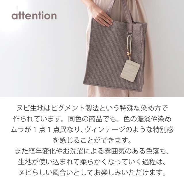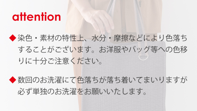 ・お洗濯は洗濯ネットや中性洗剤を使用して手洗いかドライコースで洗濯することをお勧めします。 ・ヌビバッグの生地は、染色・素材の特性上、水分・摩擦などにより色落ちすることがございます。お洋服や他バッグ等への色移りに十分ご注意下さい。 ・数回のお洗濯にて、色落ちが落ち着いてまいりますが、必ず単独のお洗濯をお願いします。 ・漂白剤は使用しないでください。 ・長時間、水につけ置きしないでください。 ・お洗濯の際に多少形が崩れたり、生地が縮むことがございます。 ・直射日光を避けて日陰で乾燥させてください。乾燥機は使用しないでください。 |
