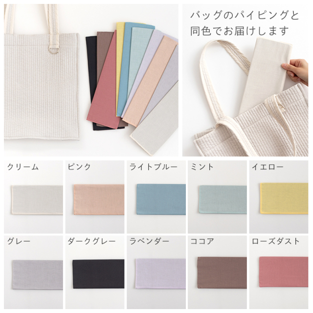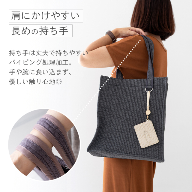 肩にかけやすい長めの持ち手はパイピングにすることで、手が痛くなりにくく、たくさん荷物を入れても安心な丈夫さに。