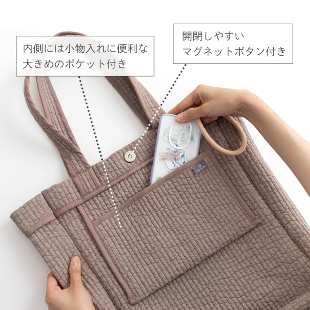 スマホや小物の収納に便利な内ポケット&開口部はマグネットボタン付きでしっかり中身を隠せます。