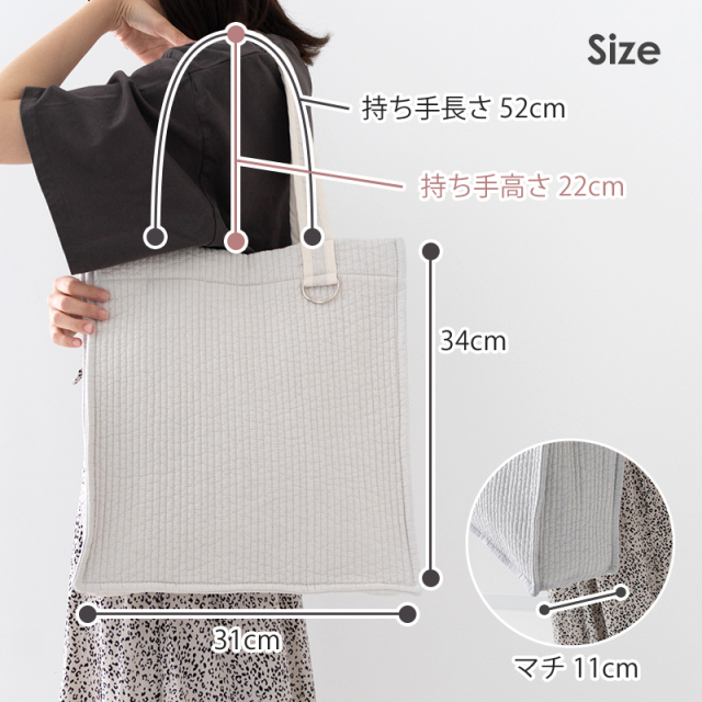 幅:約31cm×高さ:34cm×マチ:11cm 持ち手(長さ):52cm 持ち手(高さ):22cm 内ポケット 縦:約13cm×横:約22cm 底板:約32cm×11cm(厚さ2.5mm) |