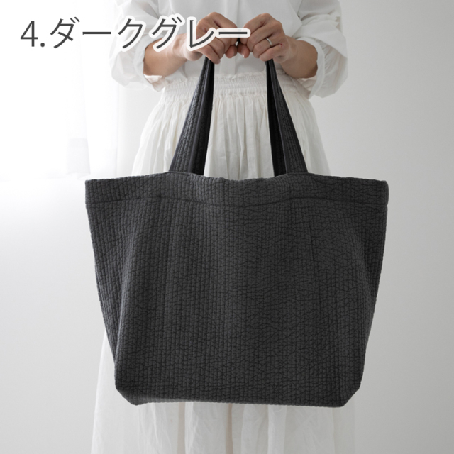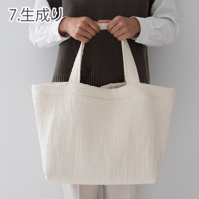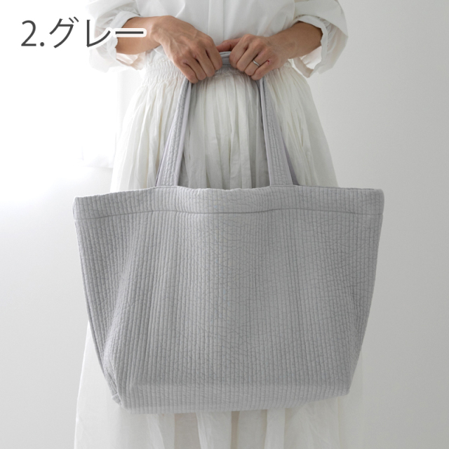 手持ち、肩掛けどちらでもバランス良く見える持ち手は、パイピング加工を施しています。肩や手が痛くなりにくく、たくさん荷物を入れても安心な丈夫さに。
