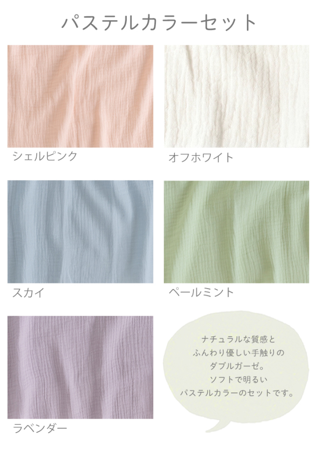 手触りやわらか、肌にも優しいガーゼ生地を、大きめサイズにカットして5枚セットにしました。