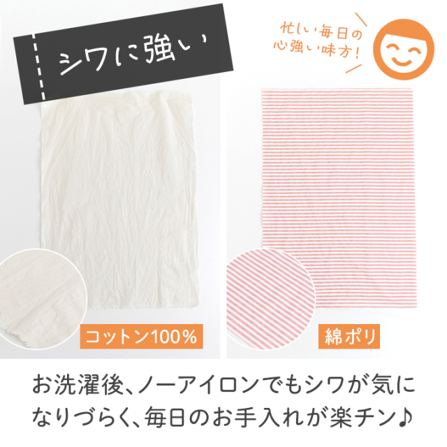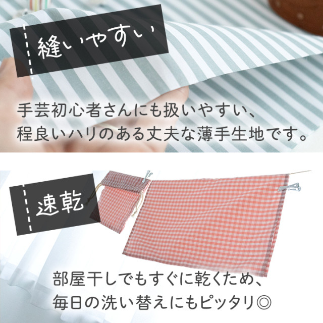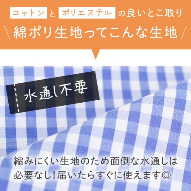 生地はノーアイロンで使える綿ポリ素材。綿のやわらかさに速乾性・防シワ性が加わり、洗ってもシワになりにくく乾きやすいので、家事の負担をぐっと減らしてくれます。水通しも不要で、思い立ったときにすぐ作り始められます。