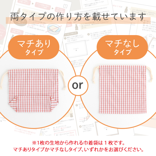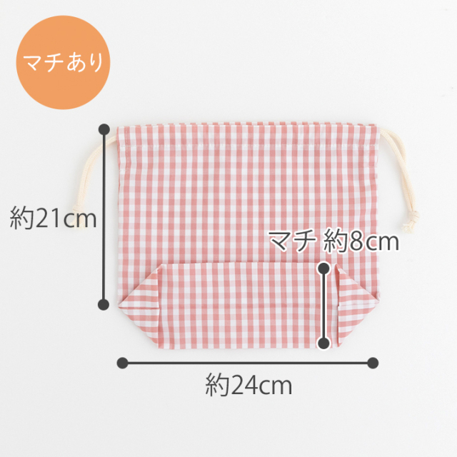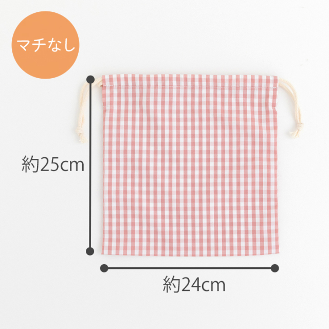 ※裁断なしでそのまま作る場合 ・マチあり巾着:約縦21cm×横24cm、マチ8cm ・マチなし巾着:約縦25cm×横24cm |