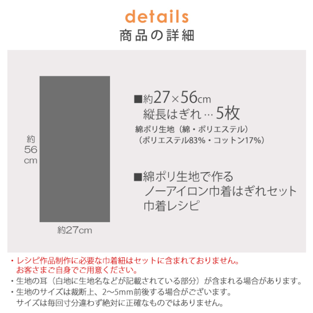 ・この商品は生地5枚とレシピのセット商品です。 ・生地のサイズは裁断上、前後する場合がございます。サイズは毎回寸分違わず絶対に正確なものではありません。 ・生地の耳(白地に生地名・メーカー名などが記載されている部分)が含まれます。 |