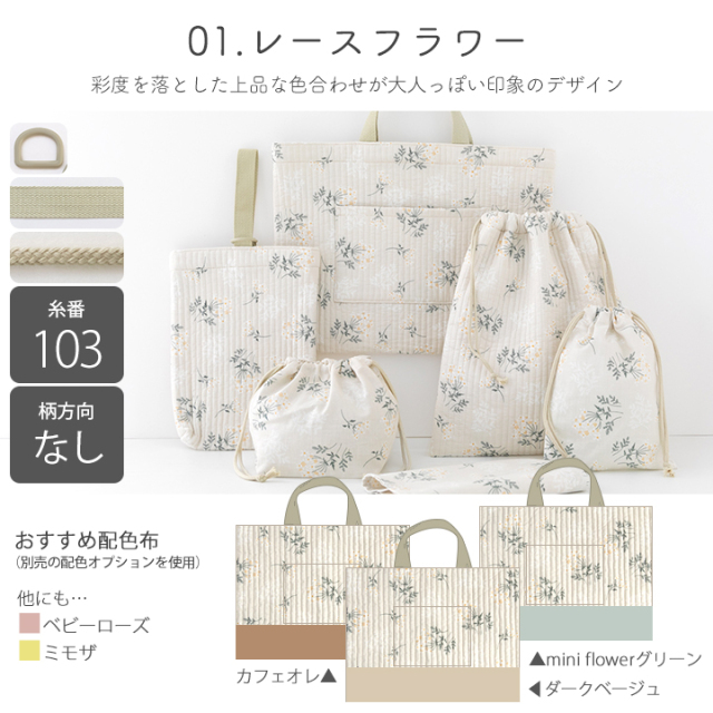 布に合わせたミシン糸、カバンの持ち手や巾着ひも、Dカンなどの副資材もキットに入っているオールインワンセットです。