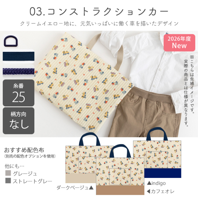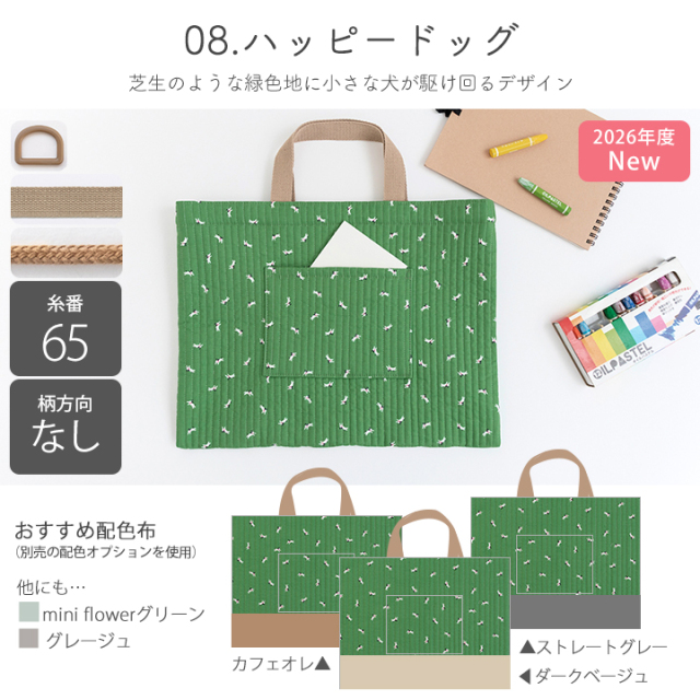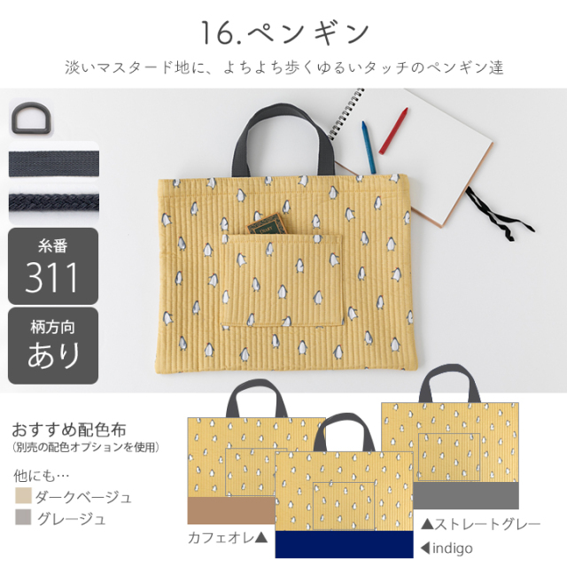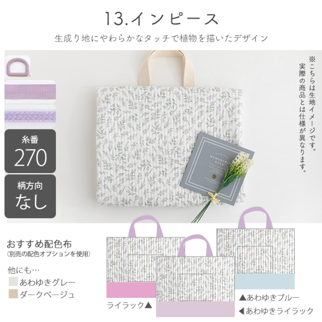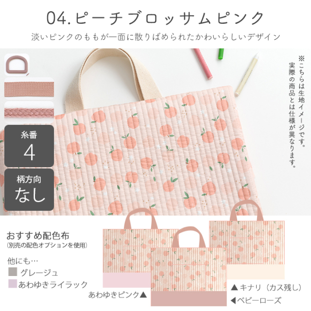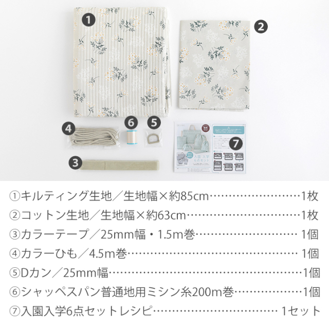 ・キルティング生地/生地幅×85cm前後:1枚 ・コットン生地/生地幅×63cm前後:1枚 ・カラーテープ/25mm幅・1.5m巻:1個 ・カラーひも/4.5m巻:1個 ・Dカン/25mm幅:1個 ・シャッペスパンミシン糸 /200m巻普通地用:1個 ・入園入学6点セットレシピ:1セット |