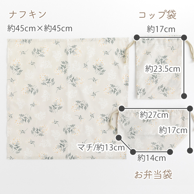 レッスンバッグ 幅:約40cm×高さ:約30cm 体操服入れ 幅:約30cm×高さ:約35cm シューズケース 幅:約17cm×高さ:約26cm×マチ:約4cm 筒回り:約42cm お弁当入れ 幅:約27cm×高さ:約17cm×マチ:約13cm 底幅:約14cm コップ入れ 幅:約17cm×高さ:約23.5cm ナフキン 約45cm×45cm ※おおよその仕上がりサイズ |