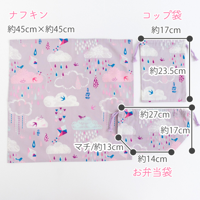 レッスンバッグ 幅:約40cm×高さ:約30cm 体操服入れ 幅:約30cm×高さ:約35cm シューズケース 幅:約17cm×高さ:約26cm×マチ:約4cm 筒回り:約42cm お弁当入れ 幅:約27cm×高さ:約17cm×マチ:約13cm 底幅:約14cm コップ入れ 幅:約17cm×高さ:約23.5cm ナフキン 約45cm×45cm ※おおよその仕上がりサイズ |