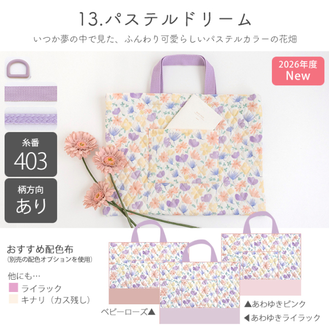 入園入学6点セット(手づくりキット) ・キルティング生地/生地幅×85cm前後:1枚 ・コットン生地/生地幅×63cm前後:1枚 ・カラーテープ/25mm幅・1.5m巻:1個 ・カラーひも/4.5m巻:1個 ・Dカン/25mm幅:1個 ・シャッペスパンミシン糸 /200m巻普通地用:1個 ・入園入学6点セットレシピ:1セット |