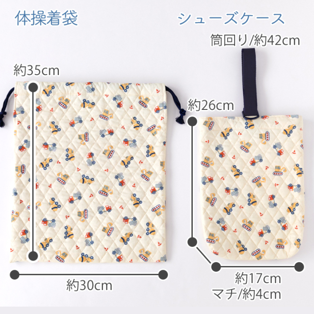 レッスンバッグ 幅:約40cm×高さ:約30cm 体操服入れ 幅:約30cm×高さ:約35cm シューズケース 幅:約17cm×高さ:約26cm×マチ:約4cm 筒回り:約42cm お弁当入れ 幅:約27cm×高さ:約17cm×マチ:約13cm 底幅:約14cm コップ入れ 幅:約17cm×高さ:約23.5cm ナフキン 約45cm×45cm ※おおよその仕上がりサイズ |