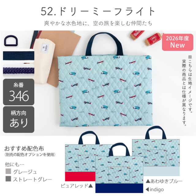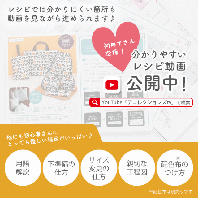 入園入学6点セット(手づくりキット) ・キルティング生地/生地幅×85cm前後:1枚 ・コットン生地/生地幅×63cm前後:1枚 ・カラーテープ/25mm幅・1.5m巻:1個 ・カラーひも/4.5m巻:1個 ・Dカン/25mm幅:1個 ・シャッペスパンミシン糸 /200m巻普通地用:1個 ・入園入学6点セットレシピ:1セット |