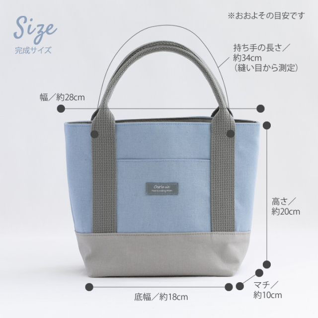 幅:約28cm、底幅:約18cm、高さ:約20cm マチ:約10cm、持ち手:約34cm ※おおよその仕上がりサイズ |