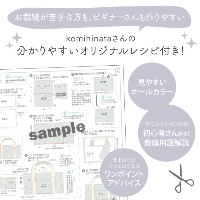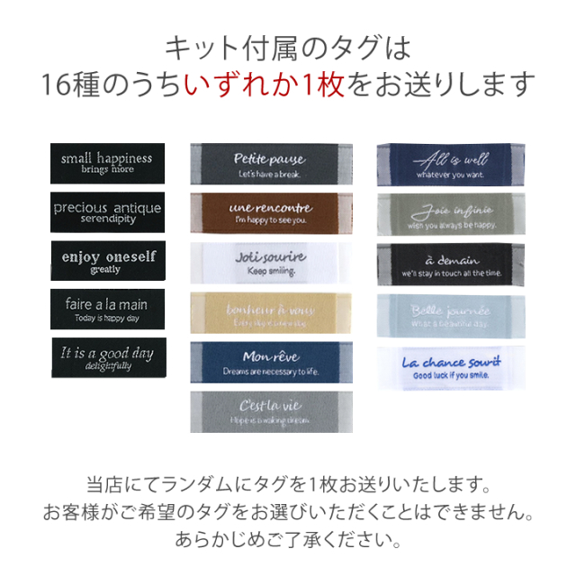 ・柄オックス生地(外布用):横33×縦55cm/1枚 ・無地オックス生地(外布・内布用):横33×縦80cm/1枚 ・接着芯:横58×縦30cm/1枚 ・ハンドル用テープ:120cm/1本 ・タグ/1枚 ・komihinataさんオリジナルレシピ タグは16種類の中からランダムにいずれか1つをお送りします。 タグのご希望にはお応えできませんので予めご了承ください。 |