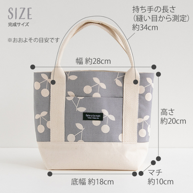幅:約28cm、底幅:約18cm、高さ:約20cm マチ:約10cm、持ち手:約34cm ※おおよその仕上がりサイズ |