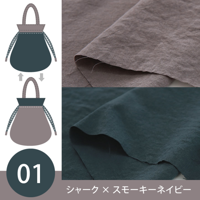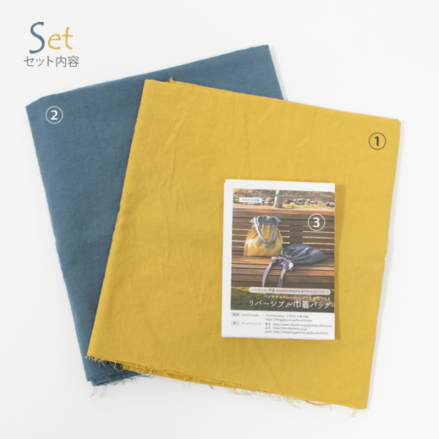 | セット内容 | ・ハーフリネン生地A(外本体布・内口布・ひも用)/縦106cm×横68cm・1枚 ・ハーフリネン生地B(内本体布・外口布・ハンドル・飾り布用)/縦106cm×横68cm・1枚 ・komihinataさんオリジナルレシピ/1セット |