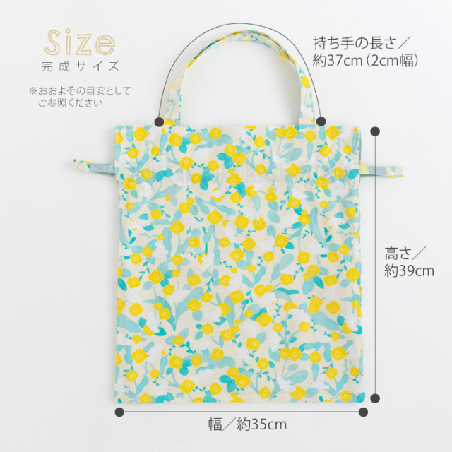 幅:約35cm、高さ:約39cm(持ち手含まず) 持ち手:約37cm(2cm幅) ※おおよその仕上がりサイズ |