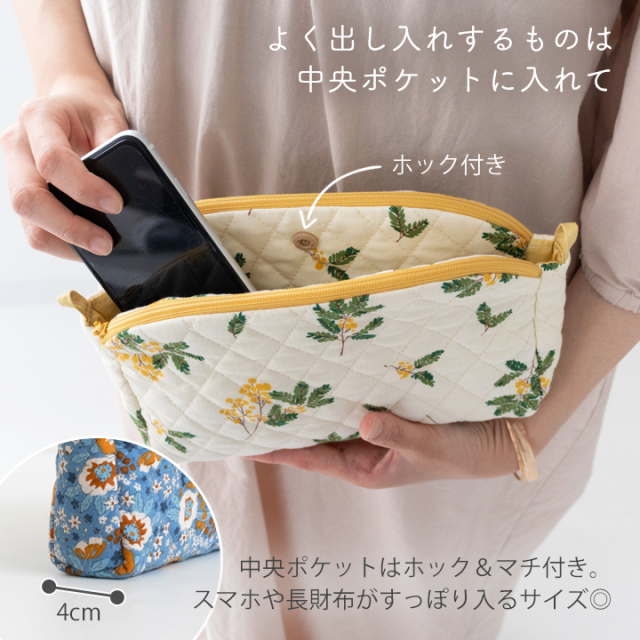 スマホなどすぐに取り出したい物は中央ポケットへ、落としたくない大事な物は2つのファスナーポーチへ入れて。