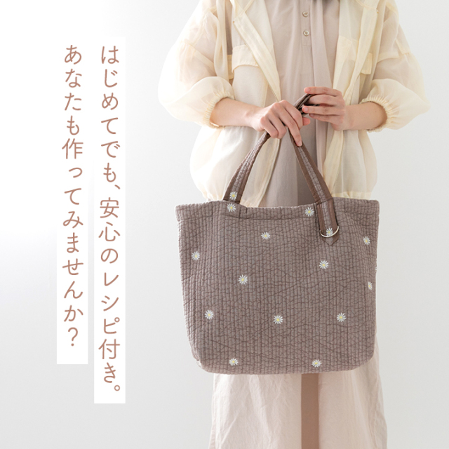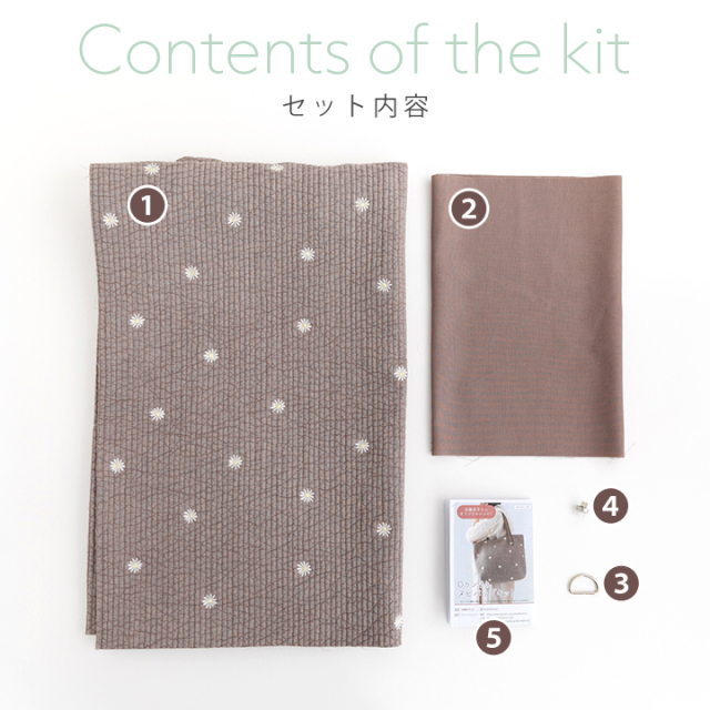 ・※刺繍ヌビキルティング生地:縦115×横57cm/1枚 ・※無地ヌビキルティング生地:縦115×横63cm/1枚 ・コットン生地:縦93×横34cm/1枚 ・Dカン30mm幅/1個 ・マグネットホック差し込みタイプ14mm/1組 ・加藤容子さんオリジナルレシピ/1セット ※ヌビキルティング生地は刺繍入りか無地のどちらか1枚が入っています |