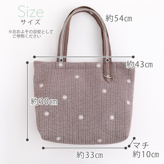 上幅:約43cm、底幅:約33cm、高さ:約30cm マチ:約10cm、持ち手長さ:約54cm ※おおよその仕上がりサイズ |