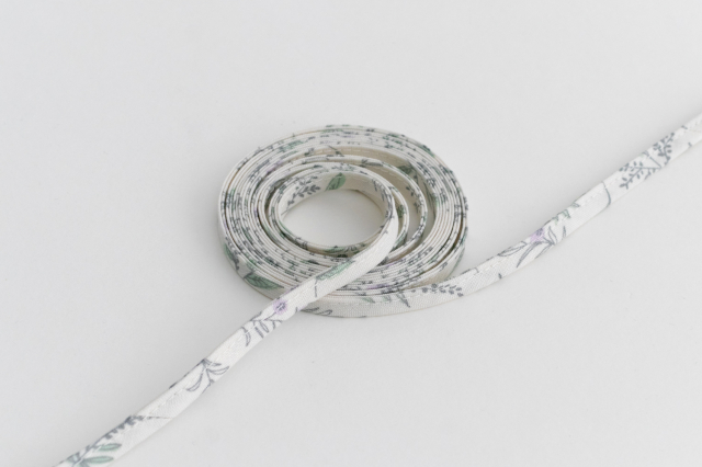 こちらの生地は「in peace」、生成り地にやわらかなタッチで植物を描いた4つ折りループひもです。